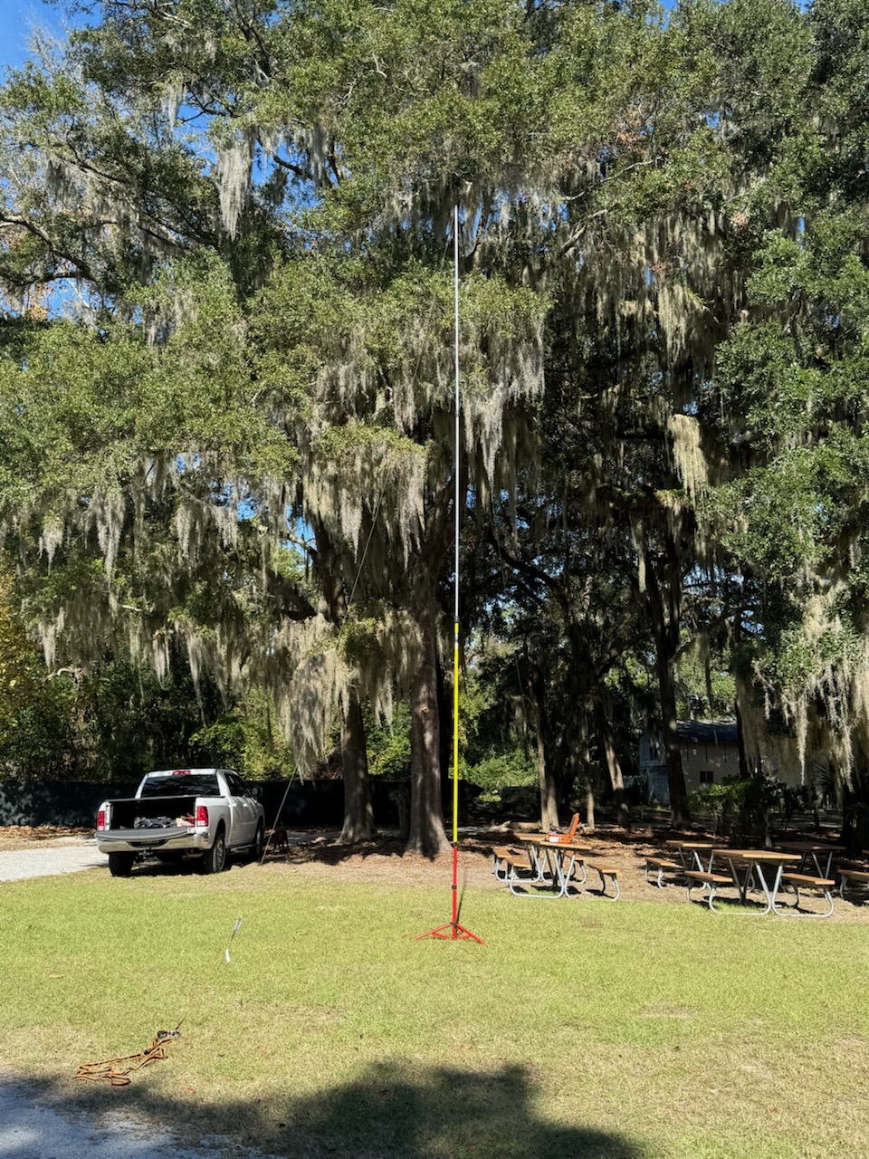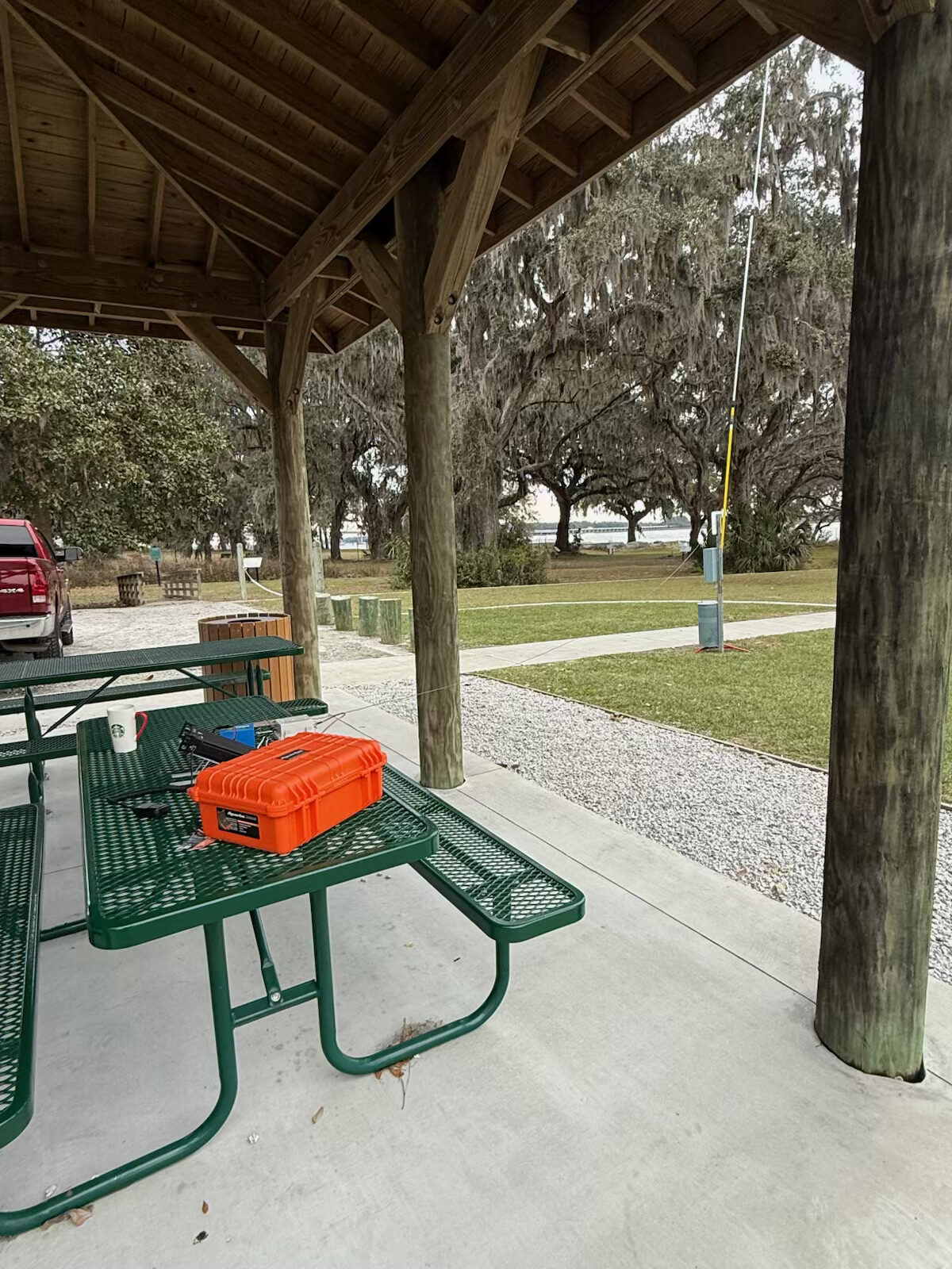 The L configuration: Many people use an inverted L, but I tested a regular L. I have about 32 feet of the radiating element wire, about four feet off the ground, extending to the pole. The wire then goes straight up the pole 28 feet. It was a windy day, and I used the edge of a garbage receptacle to hold the tripod in place. This testing also took place at park US-11995 in Port Royal, SC.