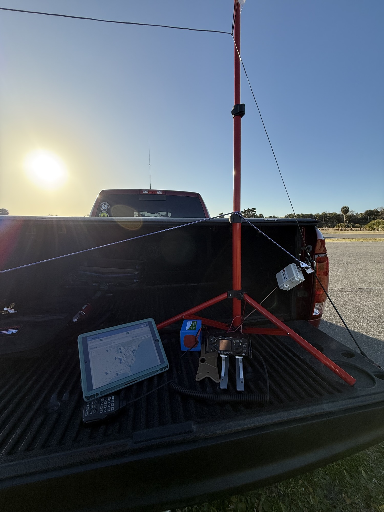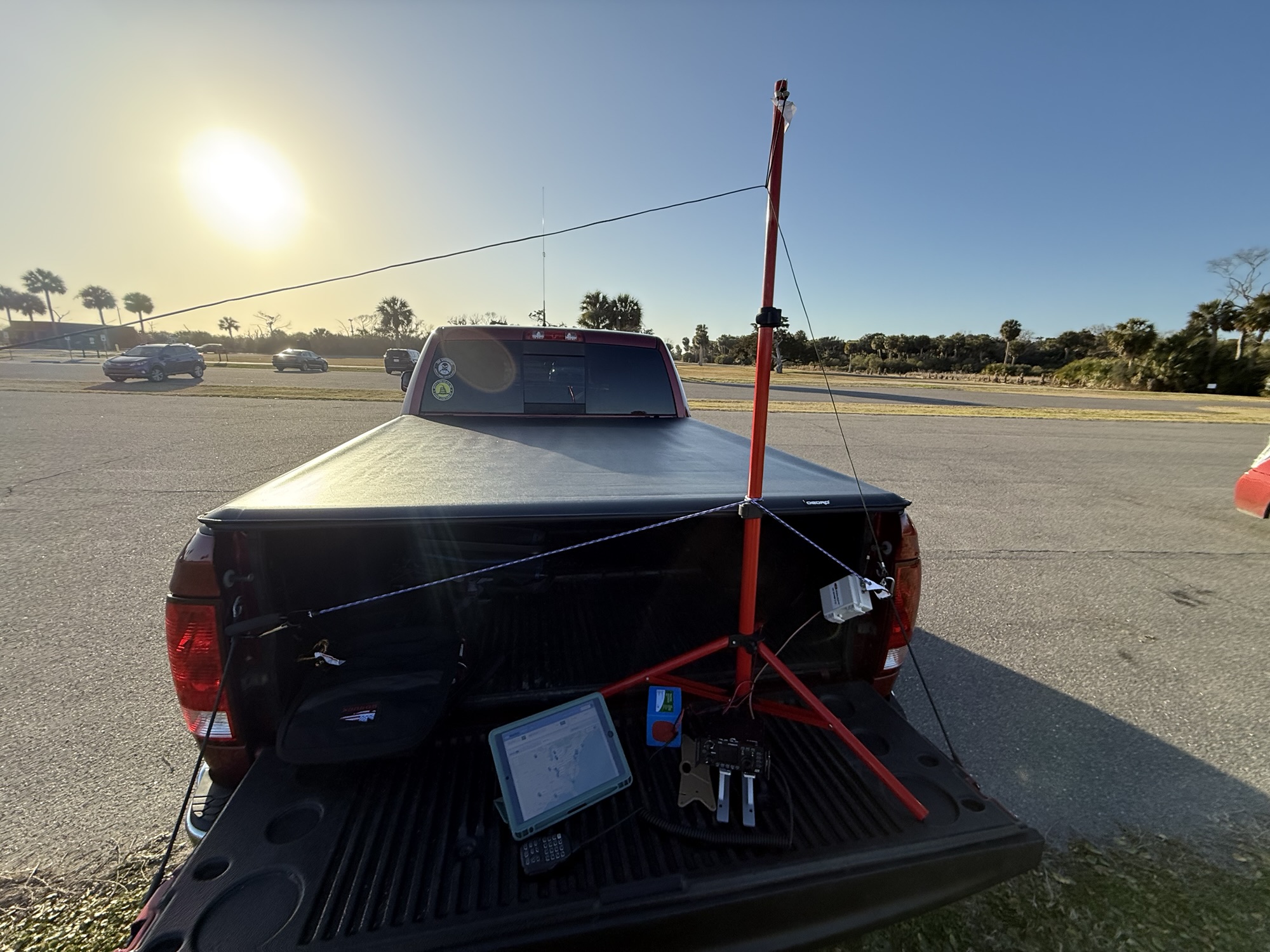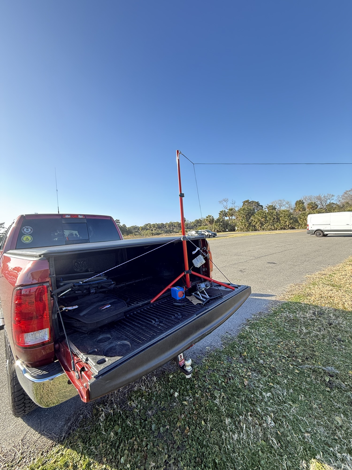 The weather was ideal for my activation—a cool late winter day in the mid 60s with crystal-clear skies. I set up my Xeigu G90 and Chameleon Emcomm end-fed half-wave antenna in a sloper configuration, operating right from the back of my truck in the parking lot. It was a perfect day to make contacts!