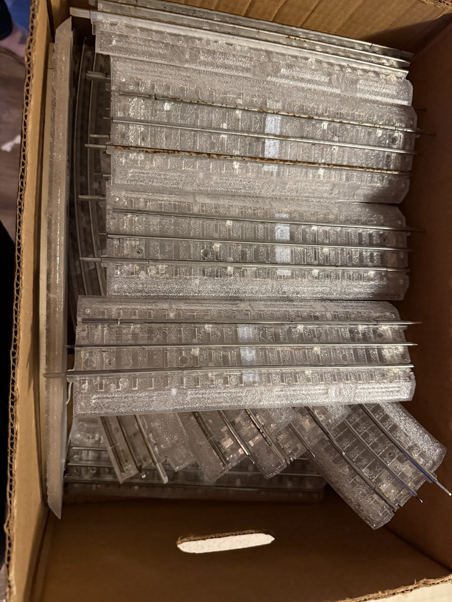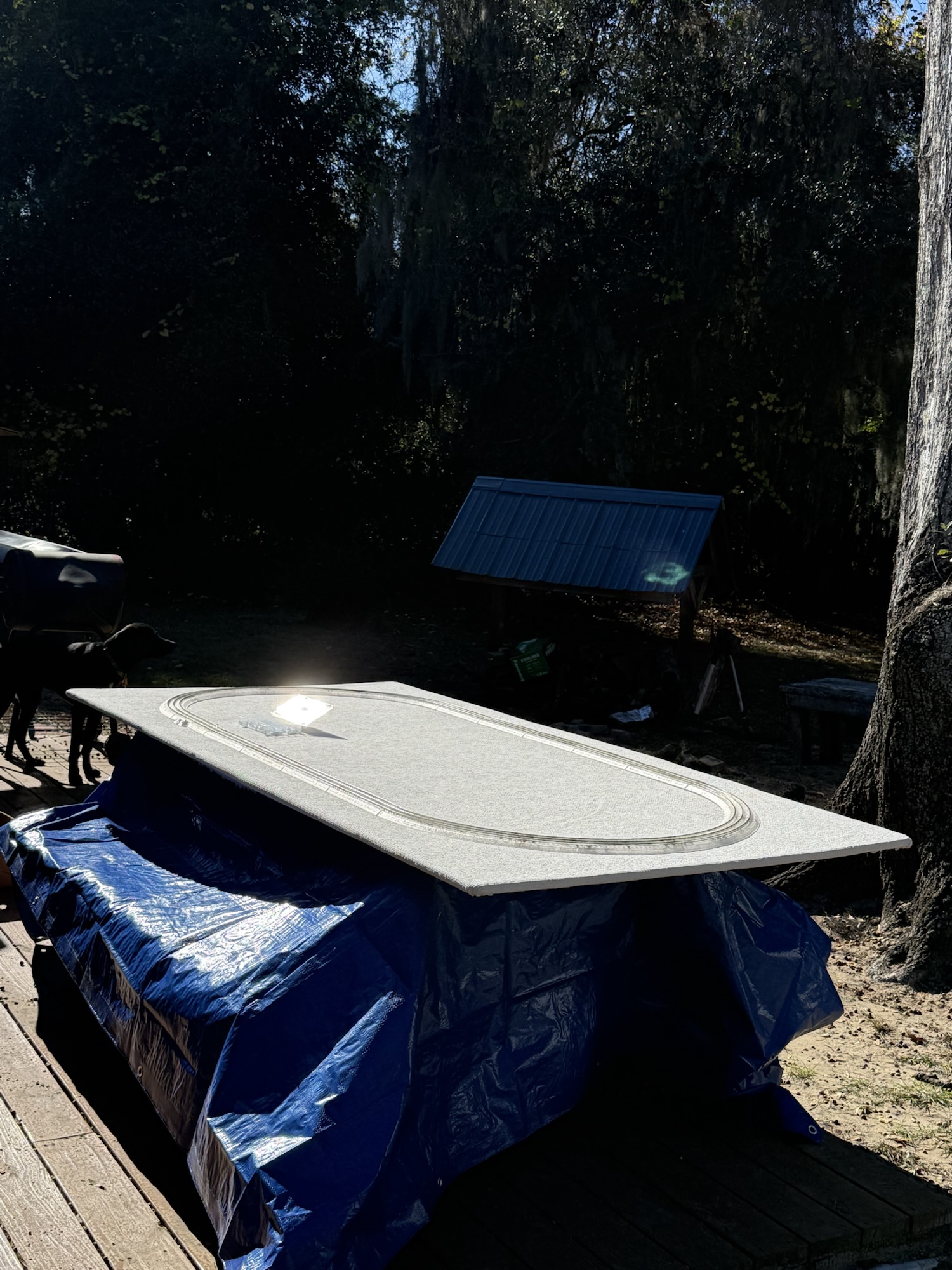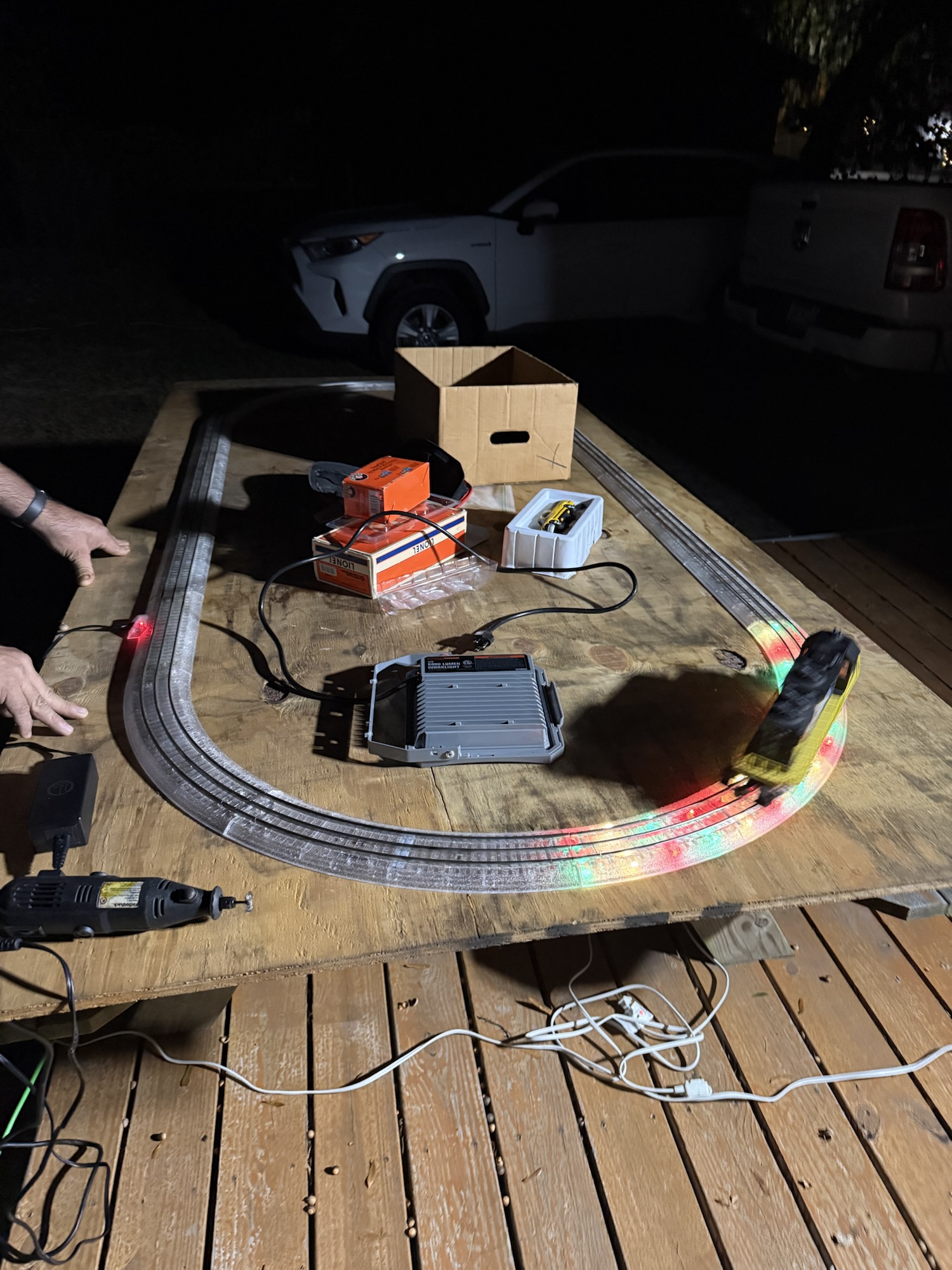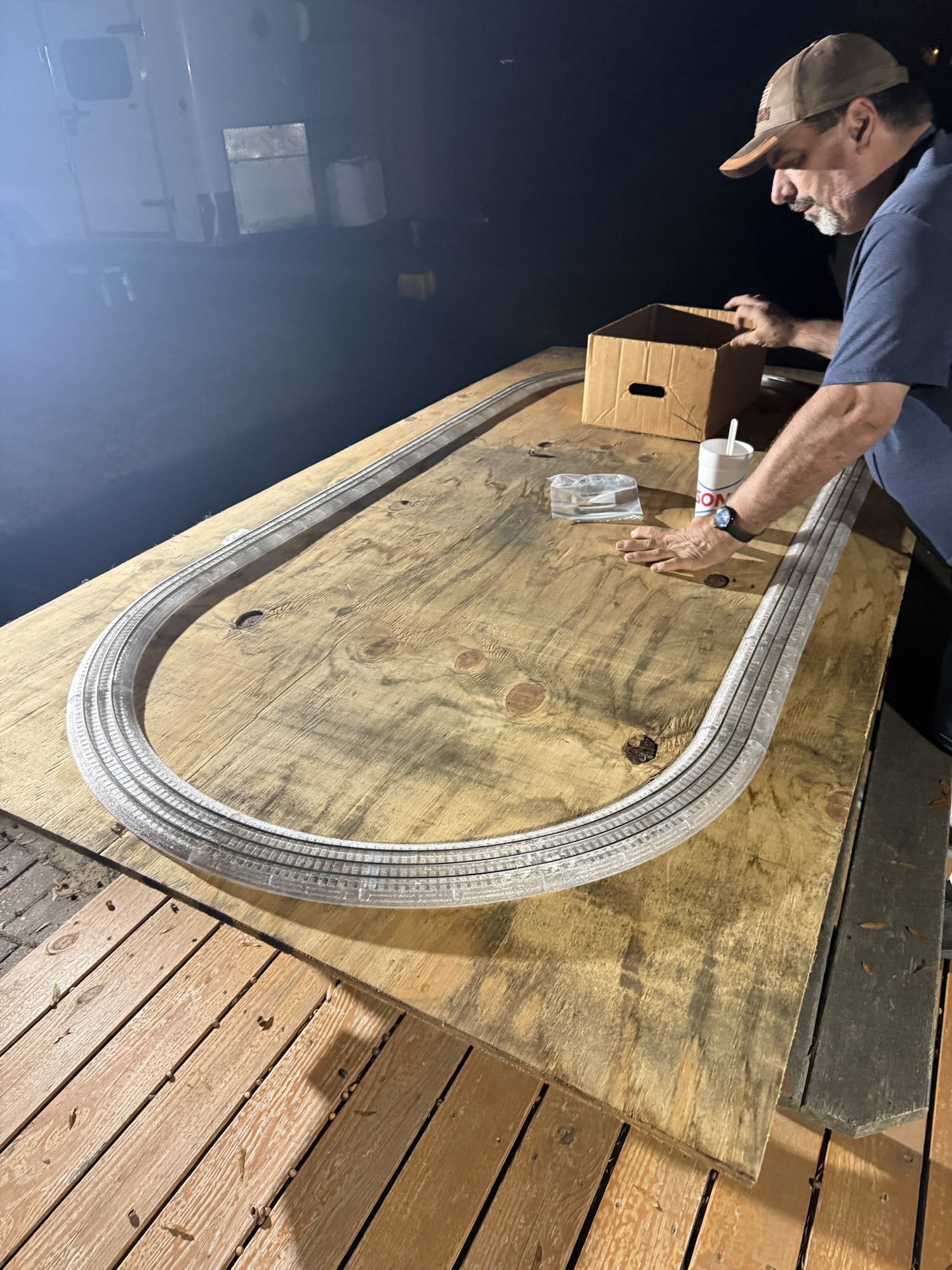 Once the general understanding of how the models will be laid out and the substructure for their supports will be constructed has been established, modelers begin to pull their trains out of the closet, attic, shed and assess their readiness for display. The track used by the model trains is tested, cleaned, and laid out. Modeler Jarrod wraps a sheet of plywood in fabric, allowing for a clean, somewhat snow-like display. A loop of lighted Lionel fast track is installed and made ready for the operation of O gauge trains.