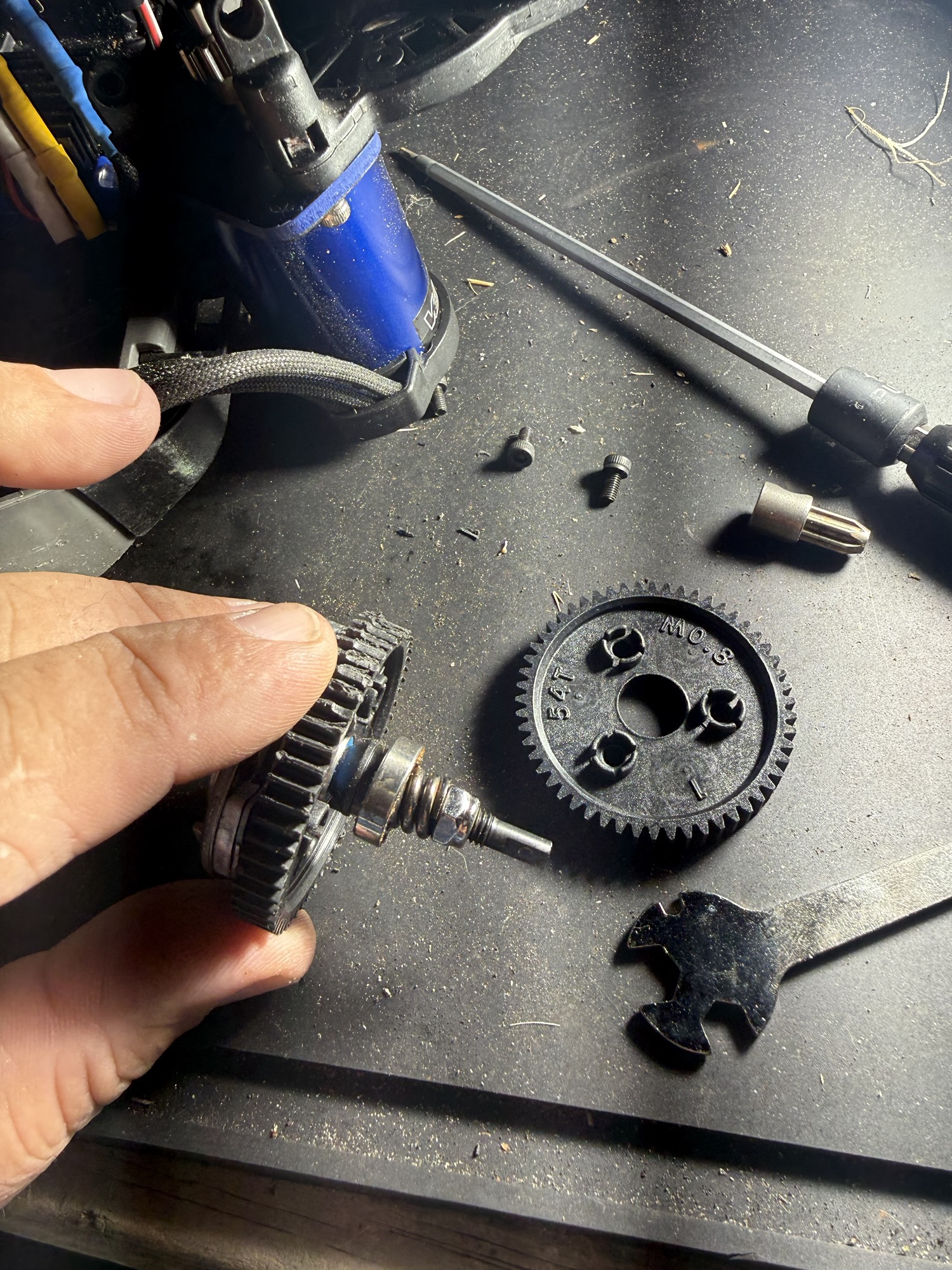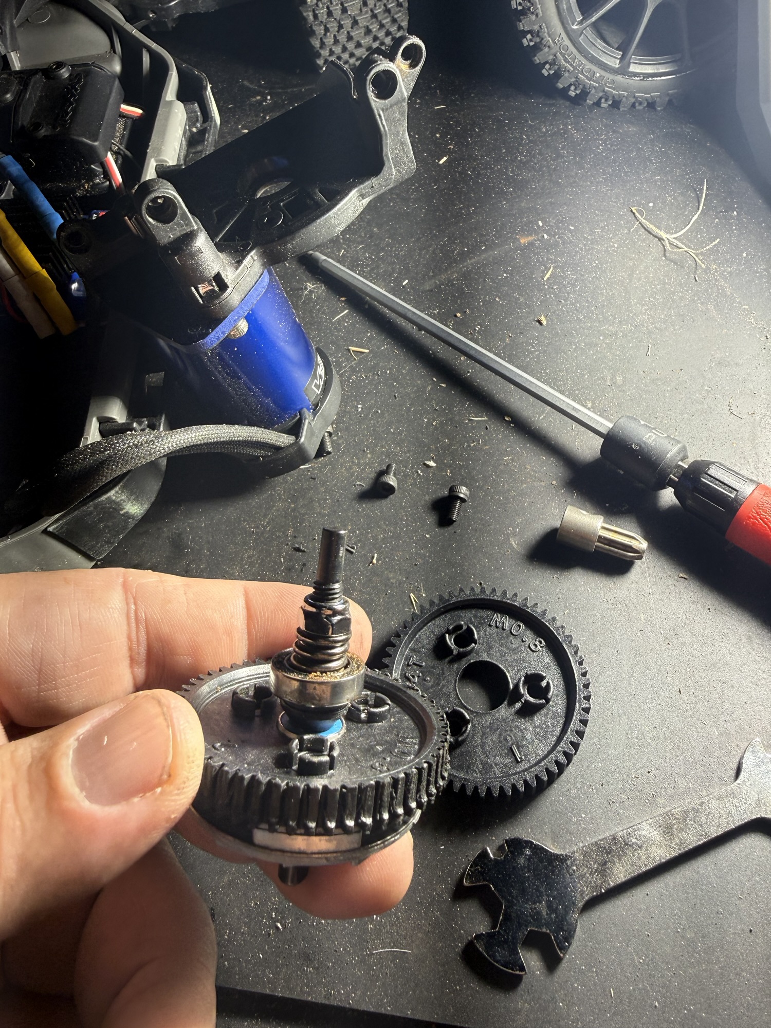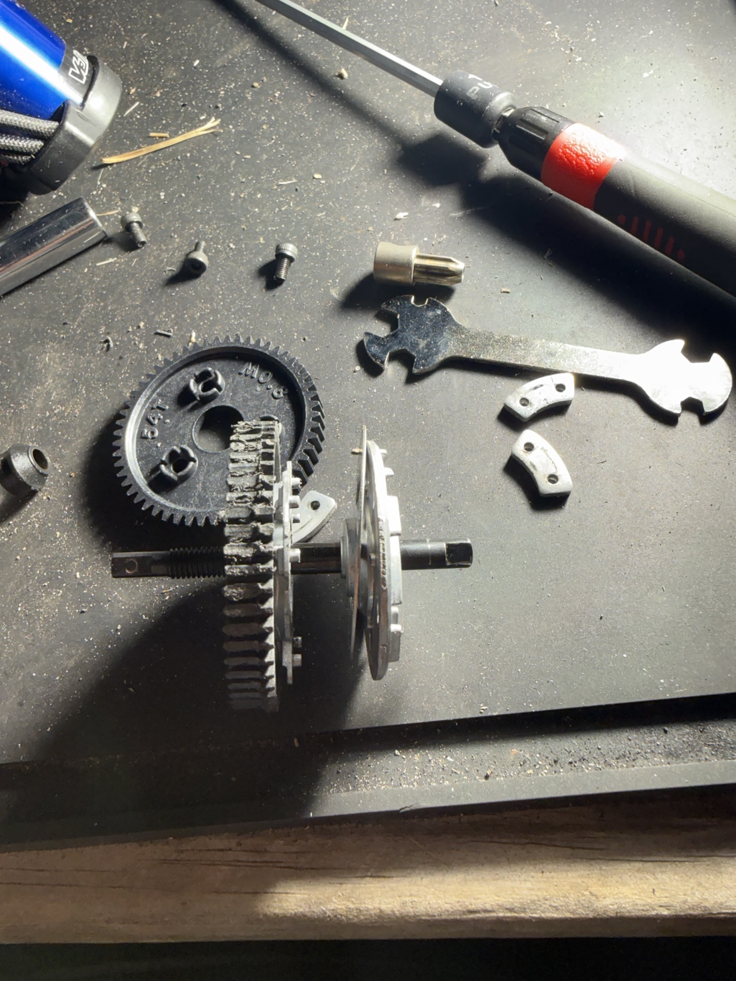 - I loosened the set screw holding the rear spur gear and slipper clutch assembly to the drive axle.