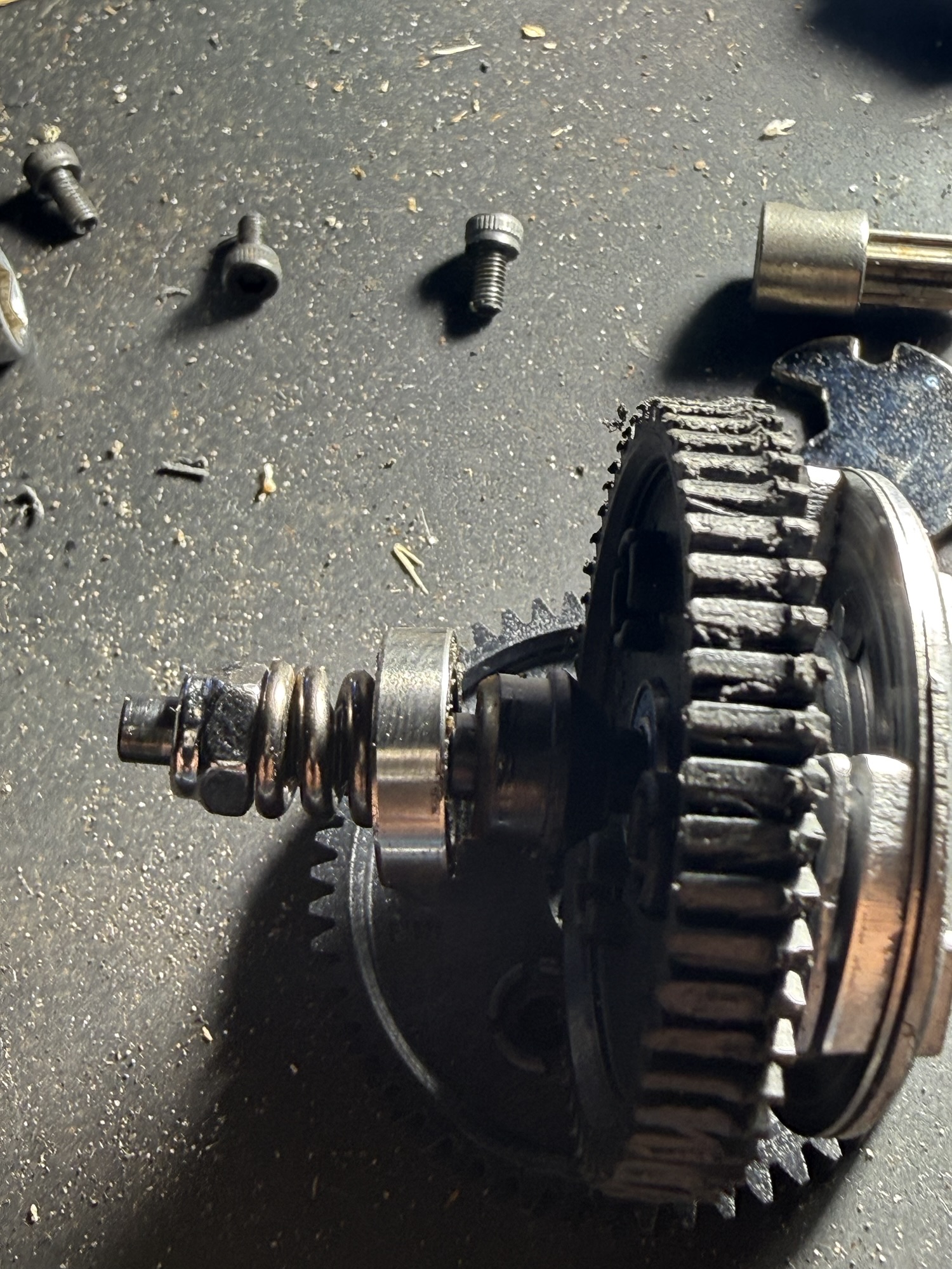 - I removed the three screws holding the spur gear to the slipper clutch assembly. (At this point, all of the small parts in the slipper clutch assembly fell apart. You will want to do this over a mat or something else, like a tray or small container, to make sure you don’t lose anything.