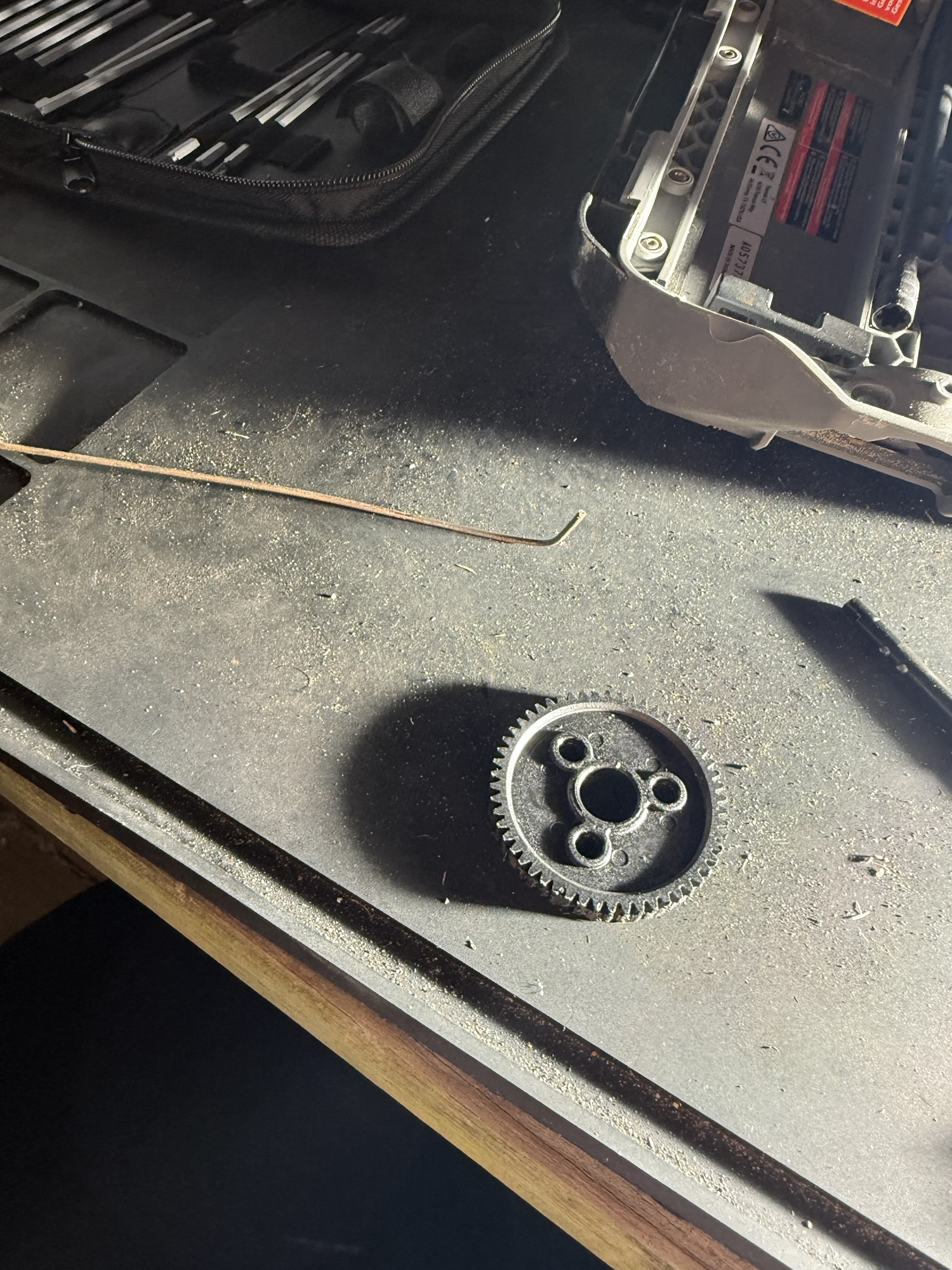 - At this point, I replaced the spur gear and put everything back together in reverse order. At one point, I lost the pin that holds the back of the slipper clutch to the assembly. I was able to fabricate one pretty easily out of an old metal locator flag I had lying around.